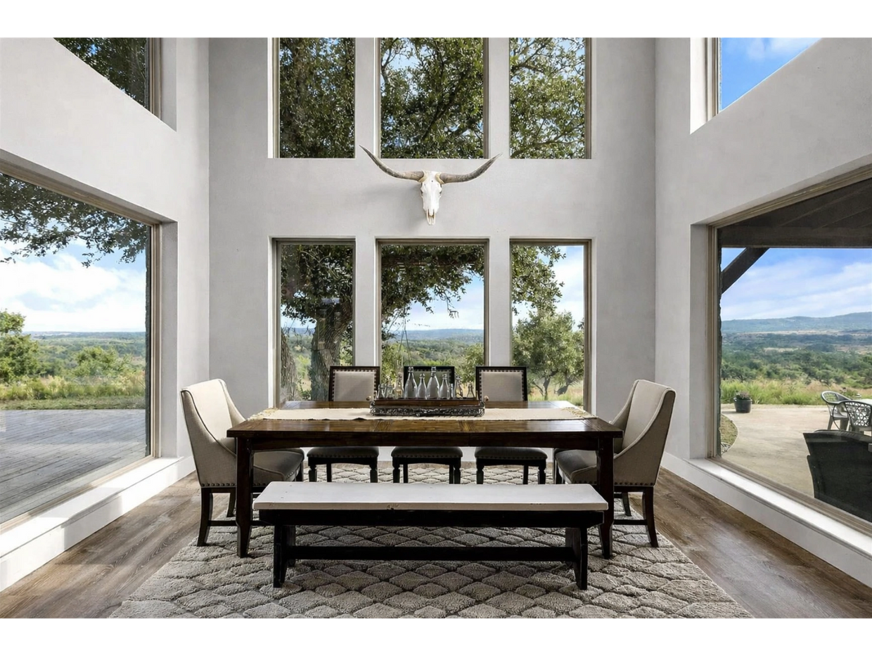 Perched high above the Texas Hill Country, this secluded hilltop retreat sits on 10 private acres and borders a 2,000-acre ranch, offering rare privacy, total quiet, and unobstructed views in every direction—no neighbors, no road noise, just open sky and rolling hills.